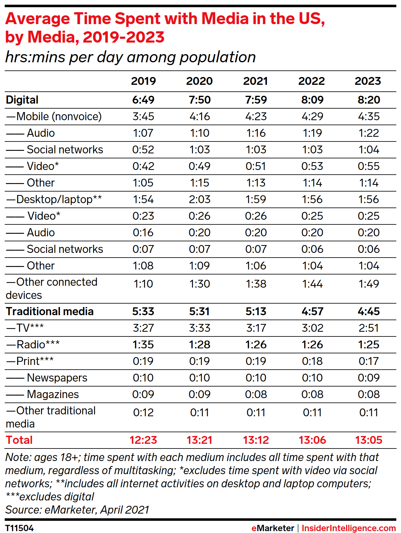 That increase in overall media time will be almost fully sustained in 2021. Adults will spend 9 minutes less with media per day this year, for an average of 13:12, and slightly less each year through the end of our forecast in 2023. The stickiness of increased engagement is impressive nonetheless, given how significantly media consumption grew during the pandemic in 2020.